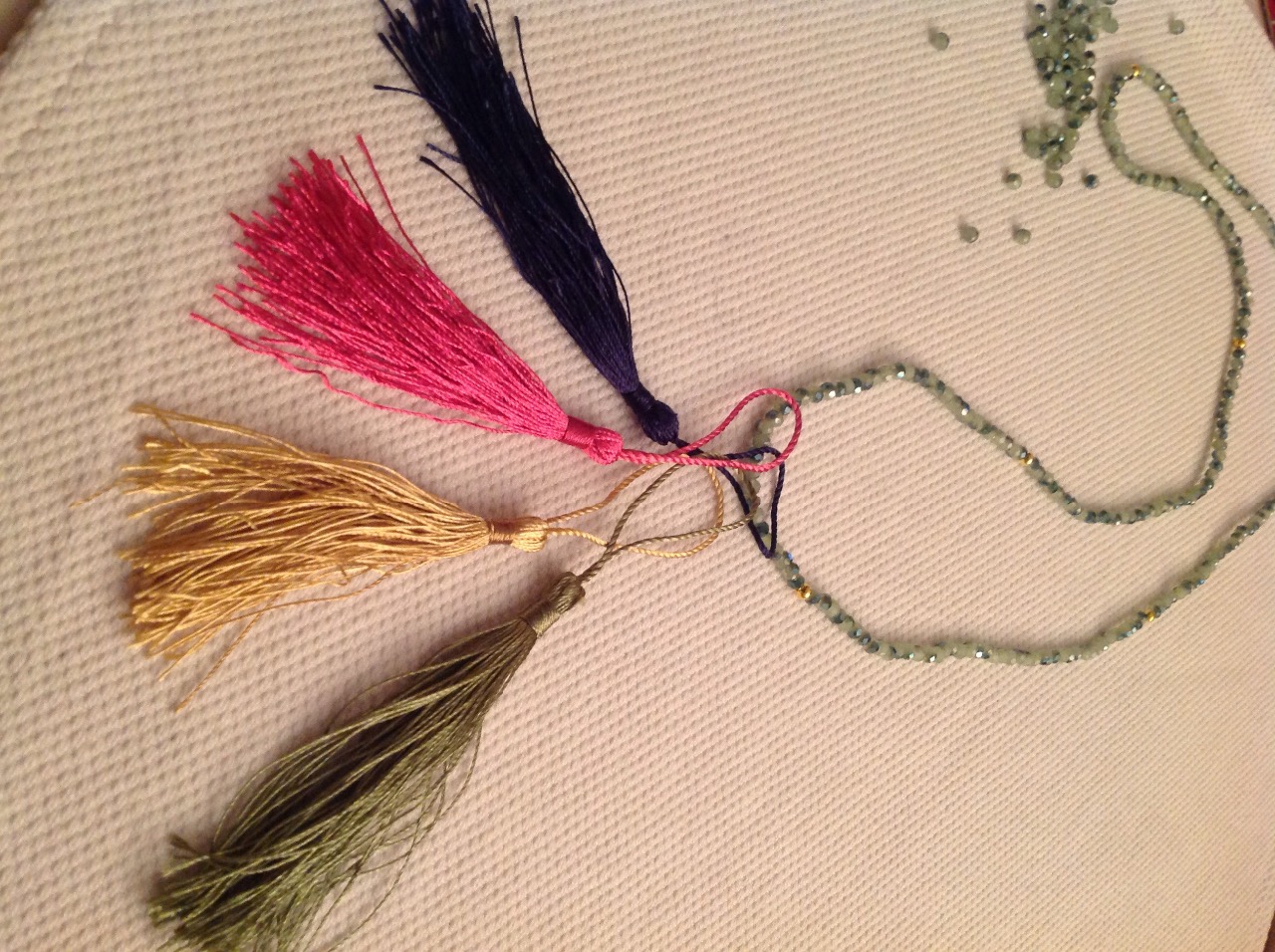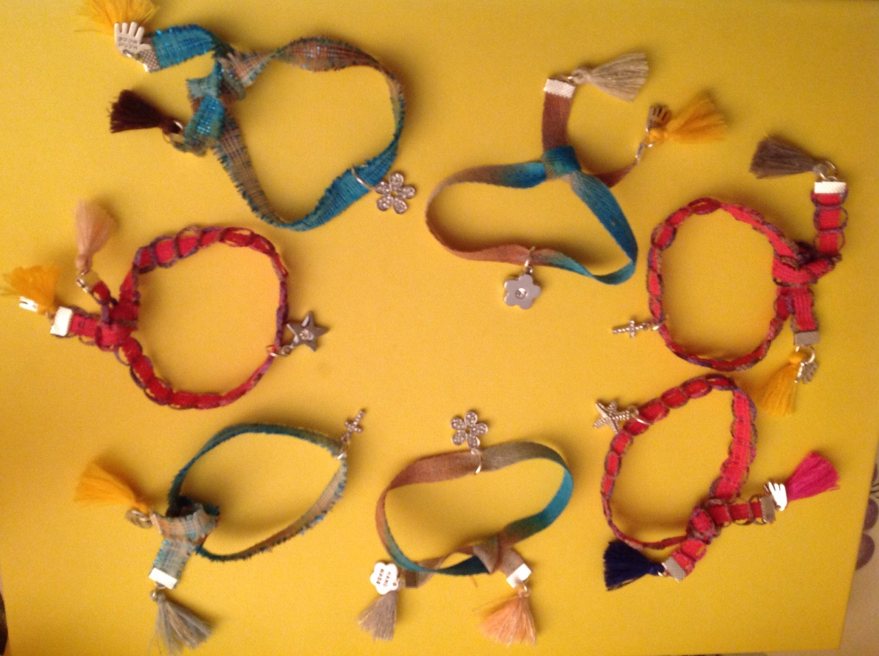 Braccialetti in tessuto con charm e nappine.