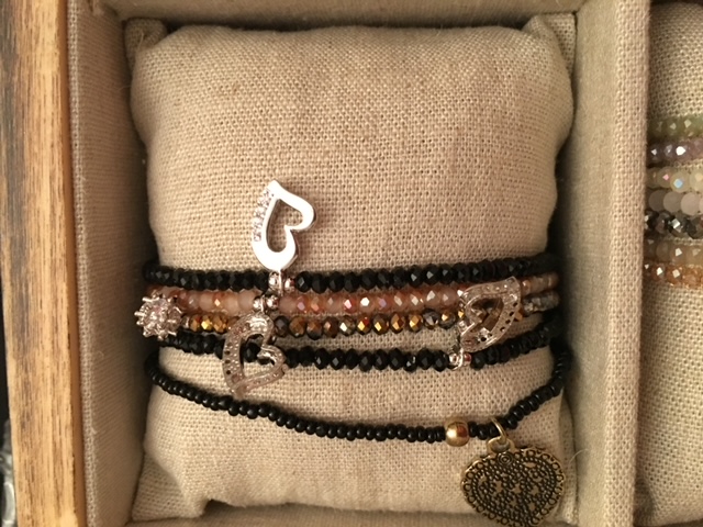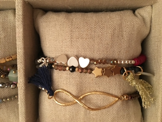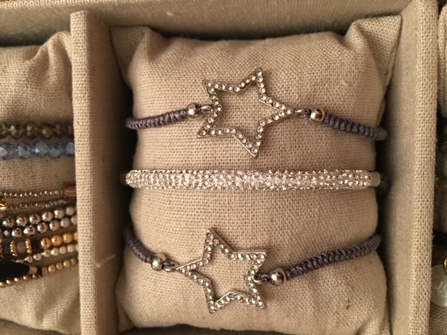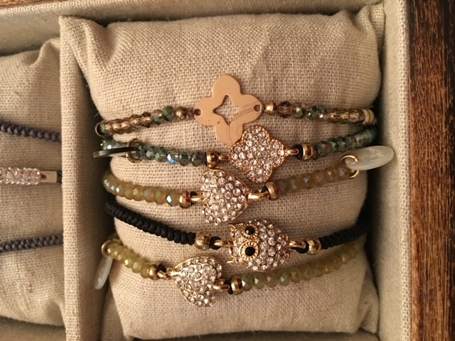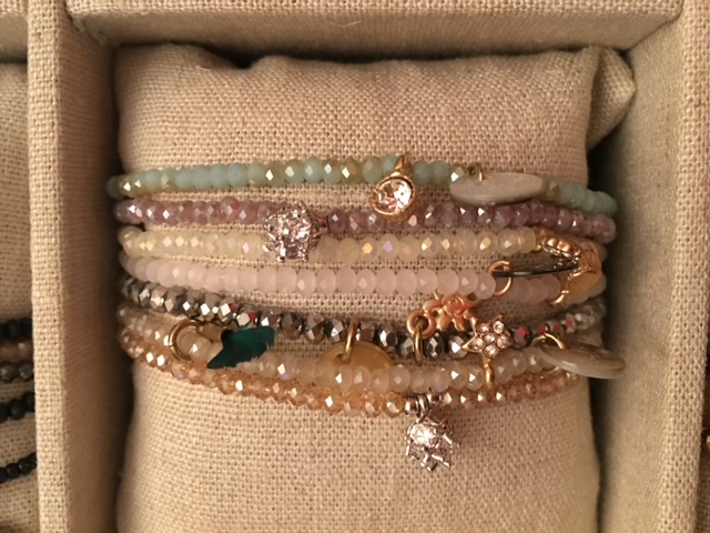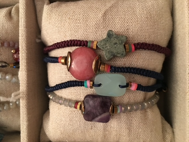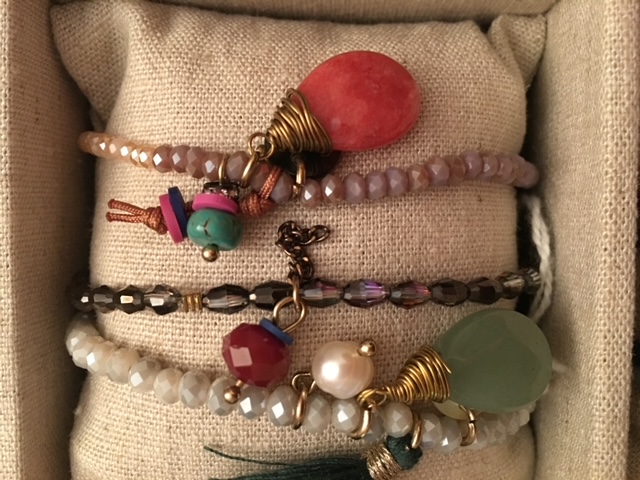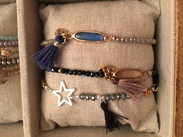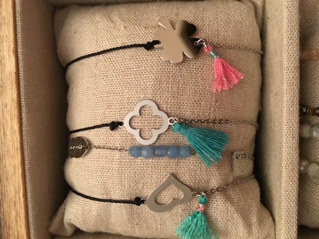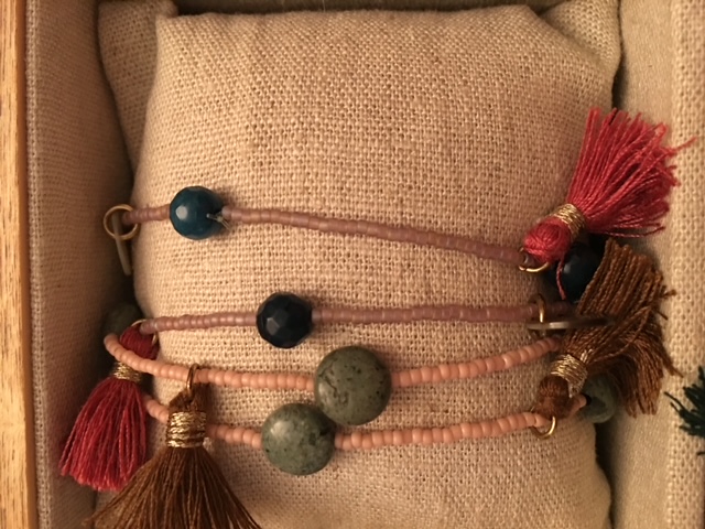 Braccialetti in tessuto con charm e nappine.